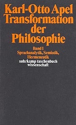 Karl-Otto Apel: Transformation der Philosophie, Band 1 und 2, Frankfurt 1976 (Band 1) und 5. Auflage 1993 (Band 2)Karl-Otto Apels zweibändige „Transformationen der Philosophie“ ist mit Sicherheit ein Klassiker der deutschen Philosophie des 20. Jahrhunderts. Worum geht es nun in diesen zwei aufregenden Bänden, die sich aus einer Reihe von sehr anspruchsvollen Aufsätzen des Autoren zusammensetzen? Ich meine es geht letztlich darum, dass der Autor auf der einen Seite meint, dass Kants Frage nach den transzendentalen Bedingungen der Möglichkeit und Gültigkeit von Wissenschaft überhaupt beantwortet werden muss,